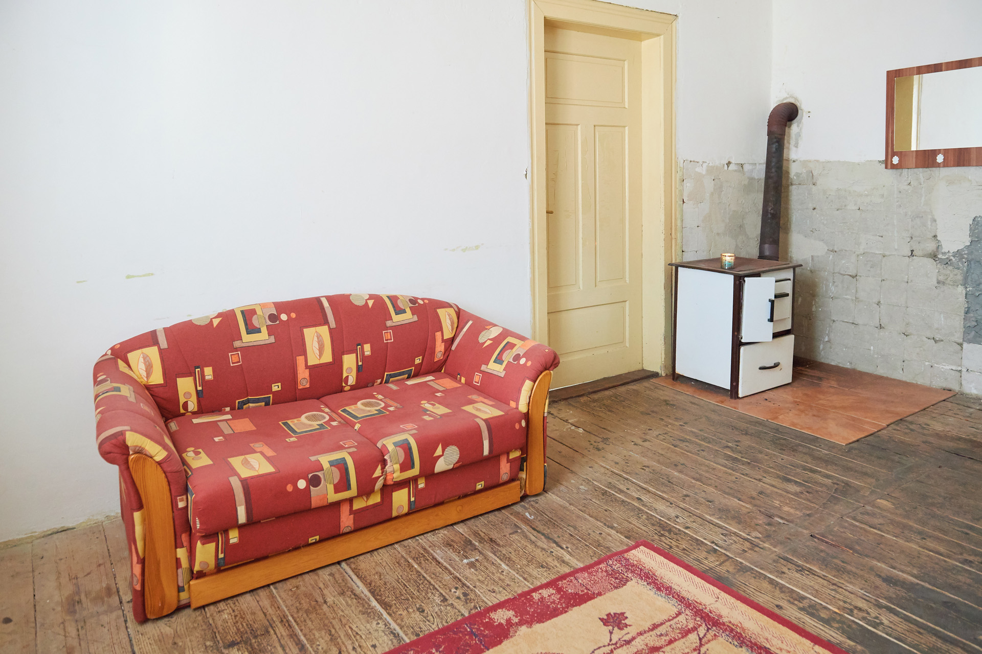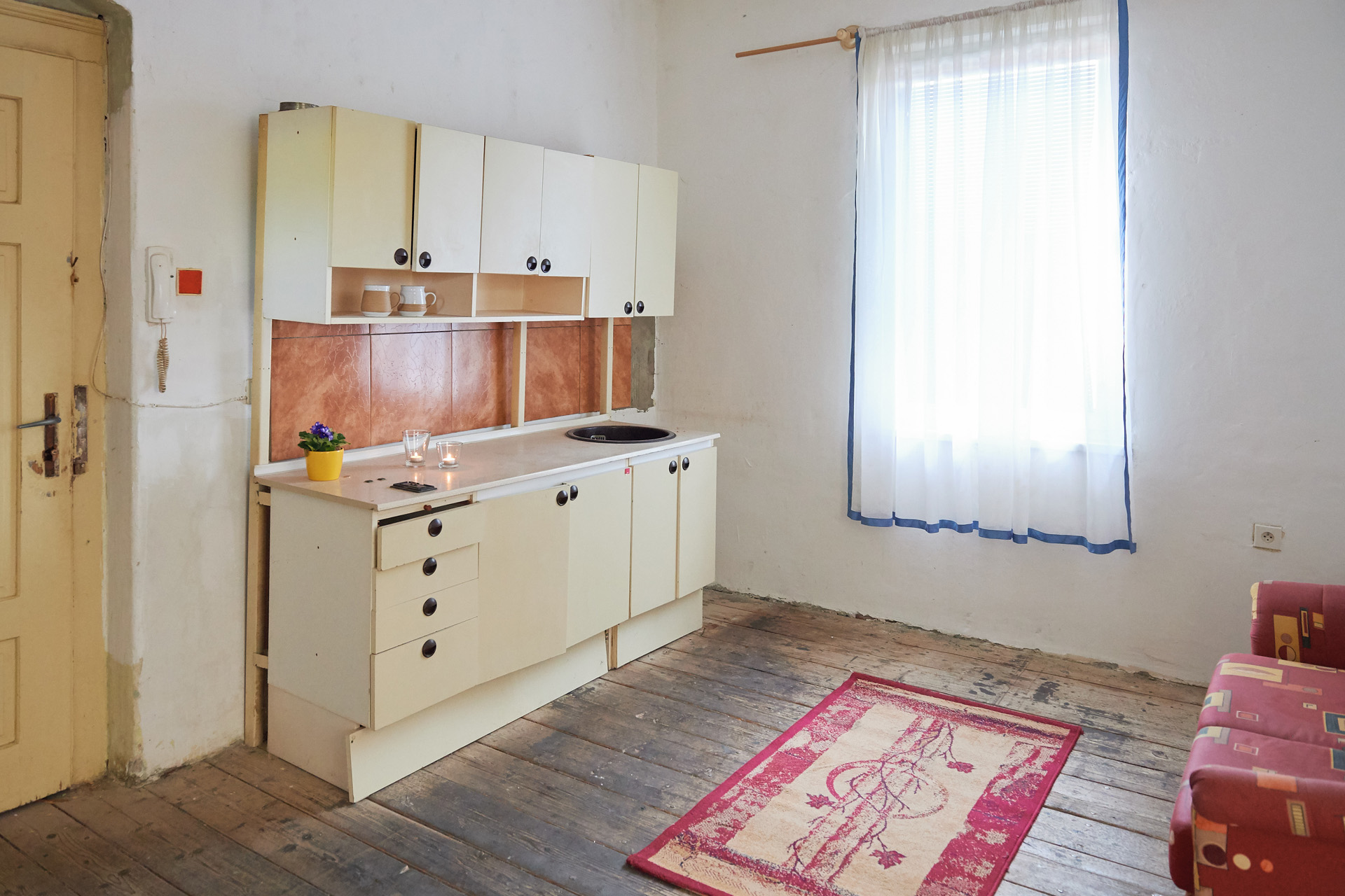 V první místnosti bytu je kuchyňka a sprchový kout. Jsou tu také kamna s plotýnkou na tuhá paliva. Druhý pokoj byl využíván jako obývací pokoj a ložnice. Samostatné WC je v mezipatře na společné chodbě.