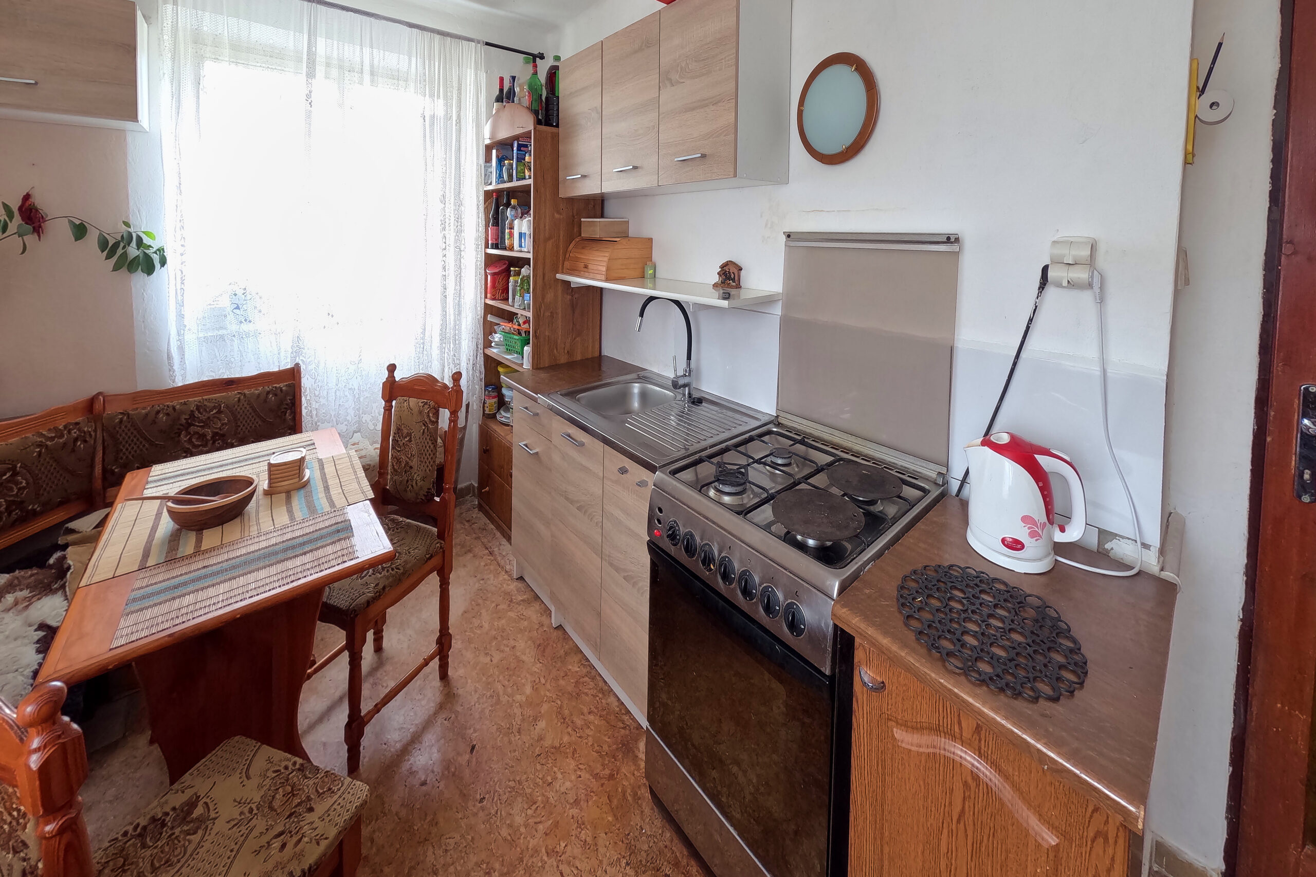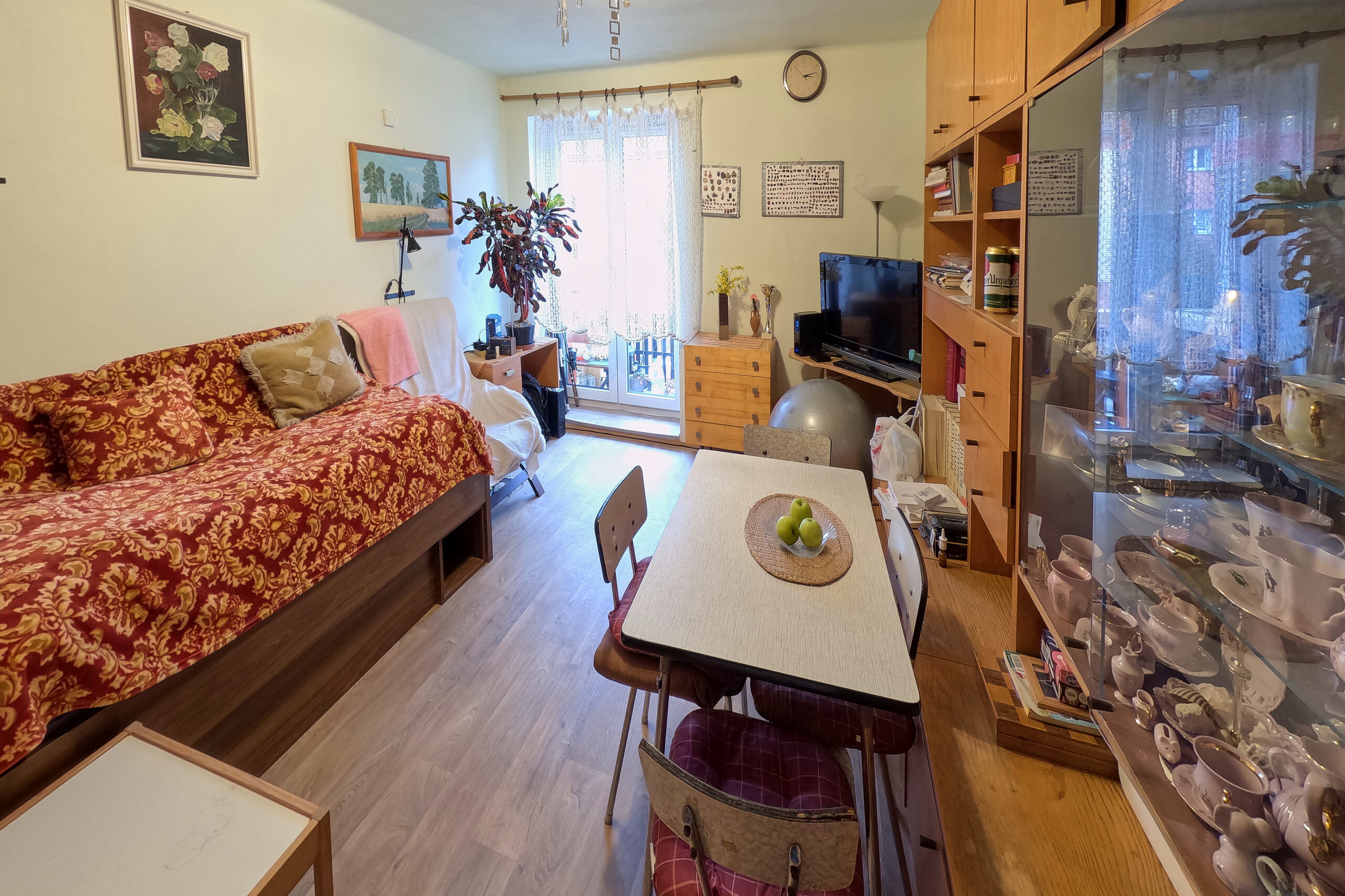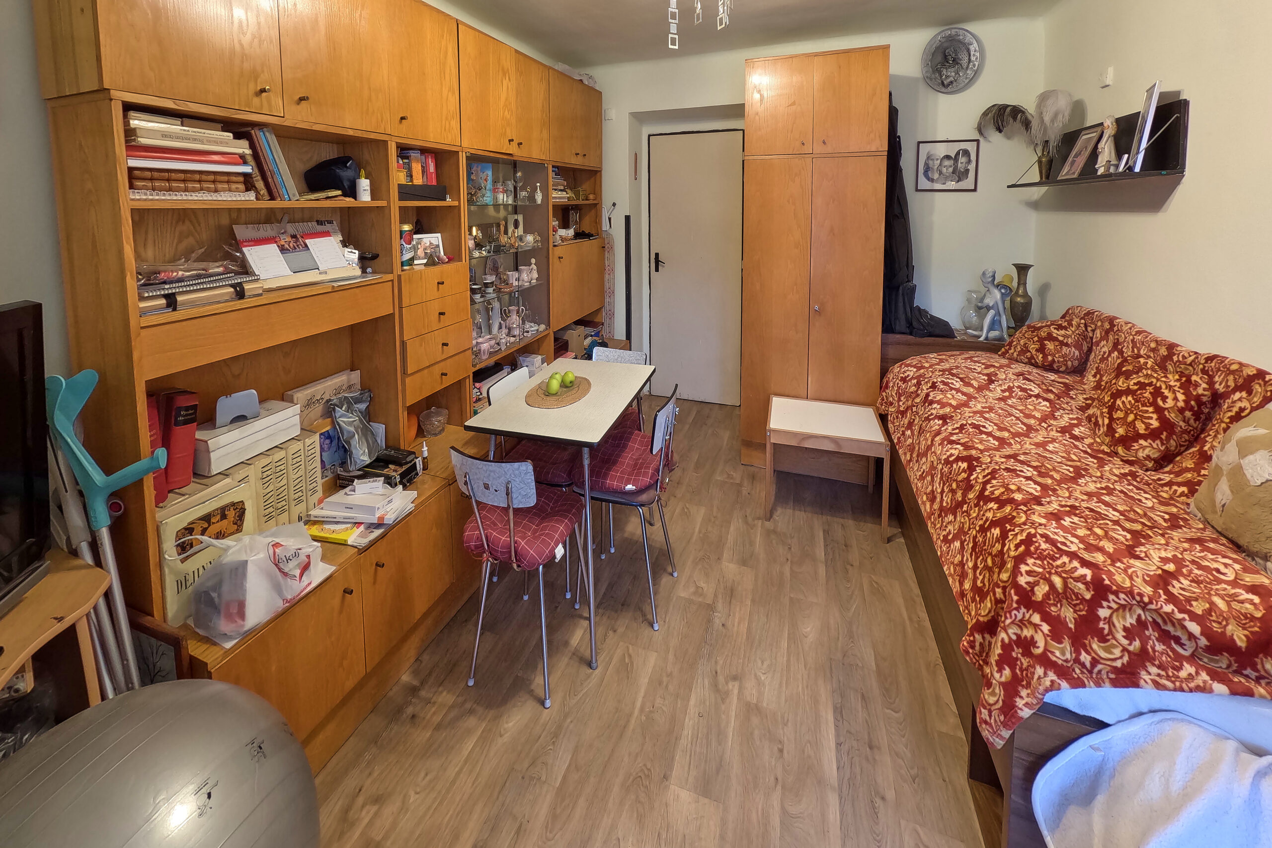 Jedná se o krajní byt s okny orientovanými na jih, západ a sever. Z chodby ve tvaru L se vstupuje do obývacího pokoje a kuchyně. V obývacím pokoji je vstup na balkón a do ložnice (v současnosti nepoužívaný). Do ložnice se vstupuje také z kuchyně, která je orientována na západ a sever. Koupelna se sprchovým koutem a WC prošla částečnou rekonstrukcí včetně rozvodu vody a odpadu. Rozvody elektřiny a okna jsou původní.