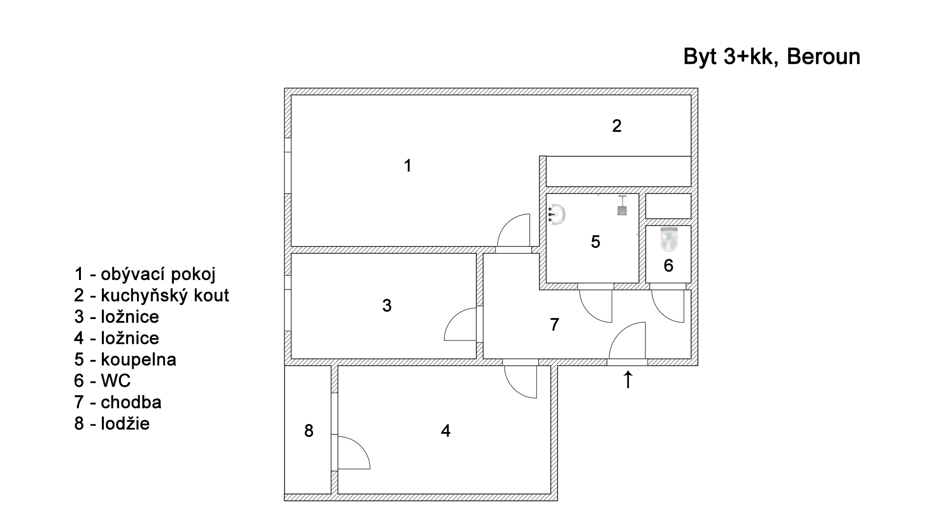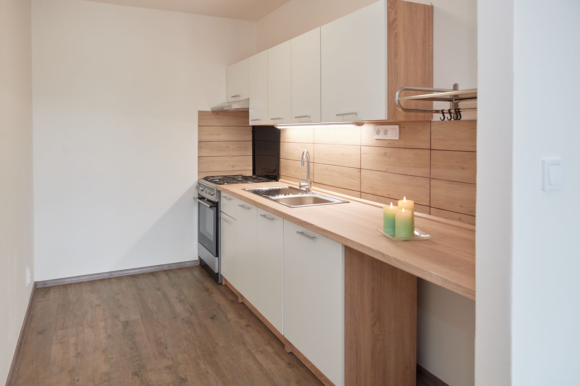 Moderně pojatý byt má velký obývací pokoj s kuchyňským koutem odděleným z části stěnou. V nově instalované kuchyňské lince jsou kombinovaná plynová kamna s elektrickou troubou a příprava na instalaci myčky. Lodžie i velká okna obývacího pokoje a obou dalších pokojů jsou orientována na východ. K dispozici je také koupelna se sprchovým koutem a samostatná toaleta v moderně pojatém designu. Vstupní chodba je dostatečně prostorná pro vybudování úložných prostor.