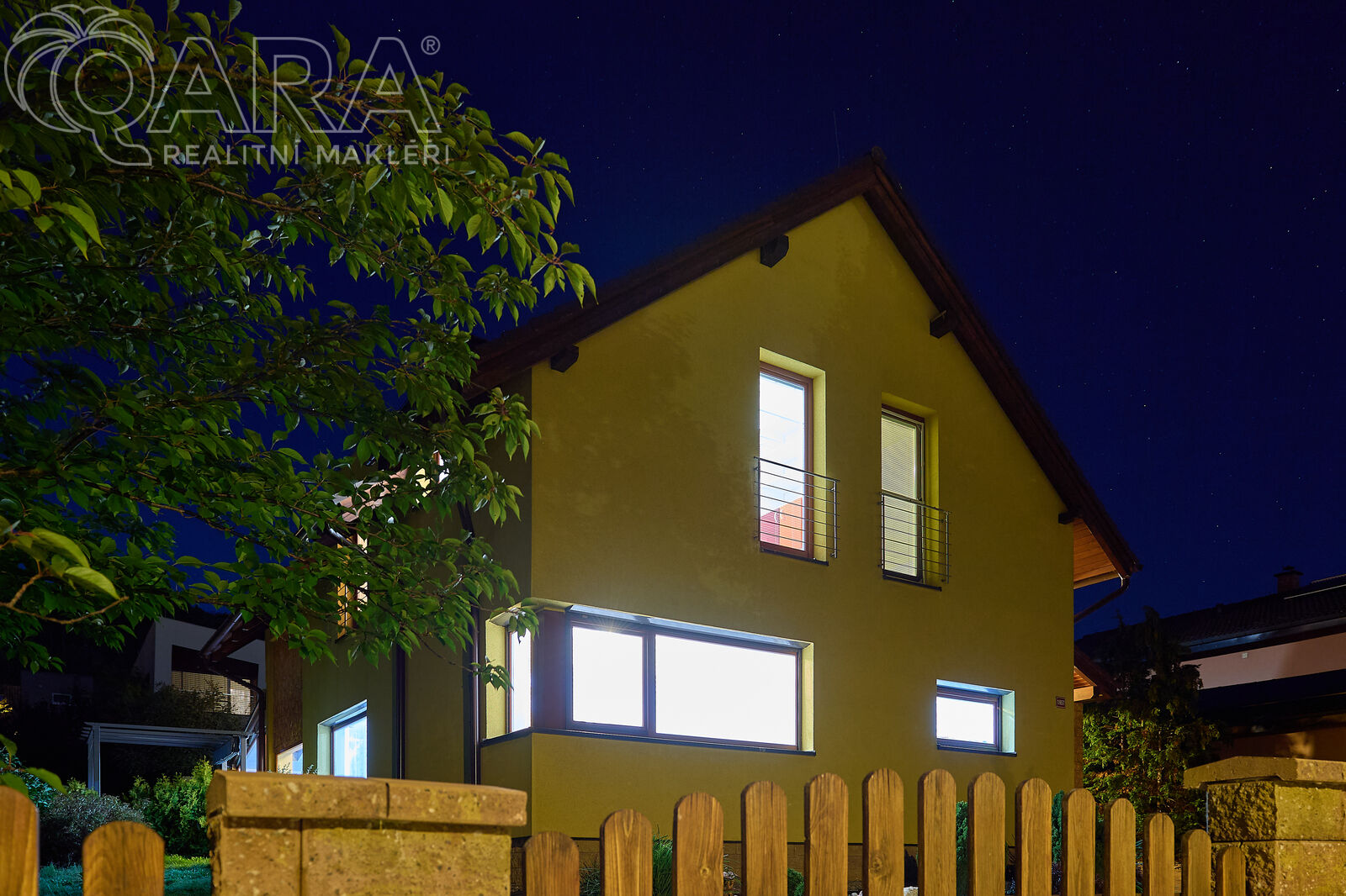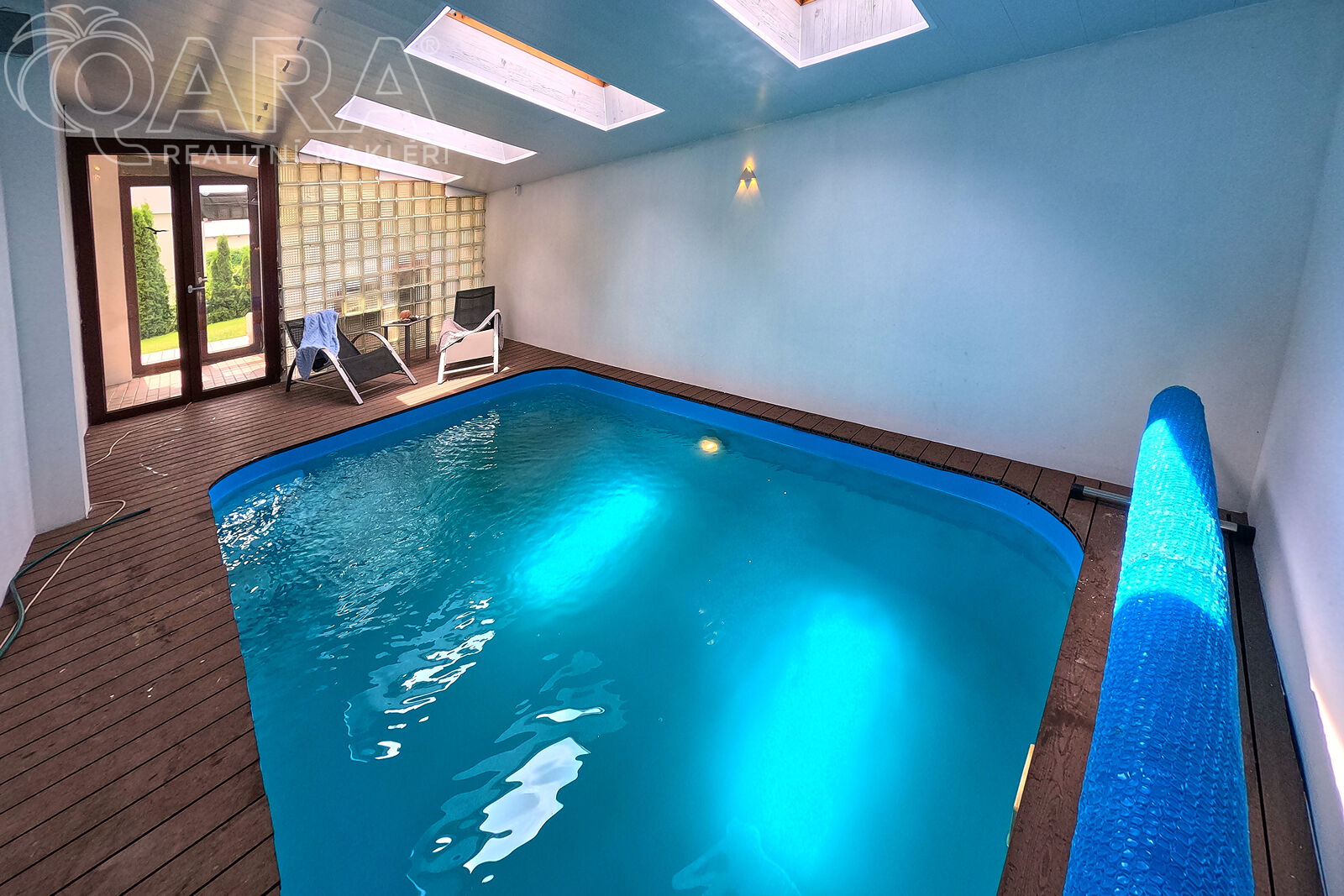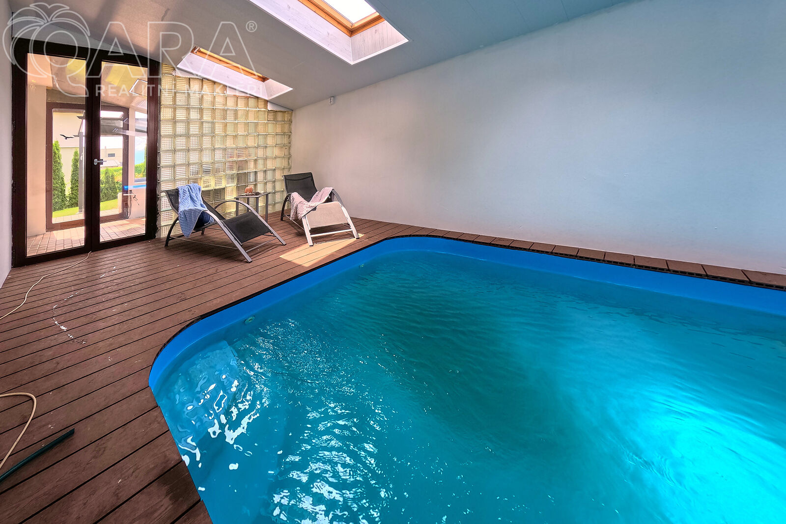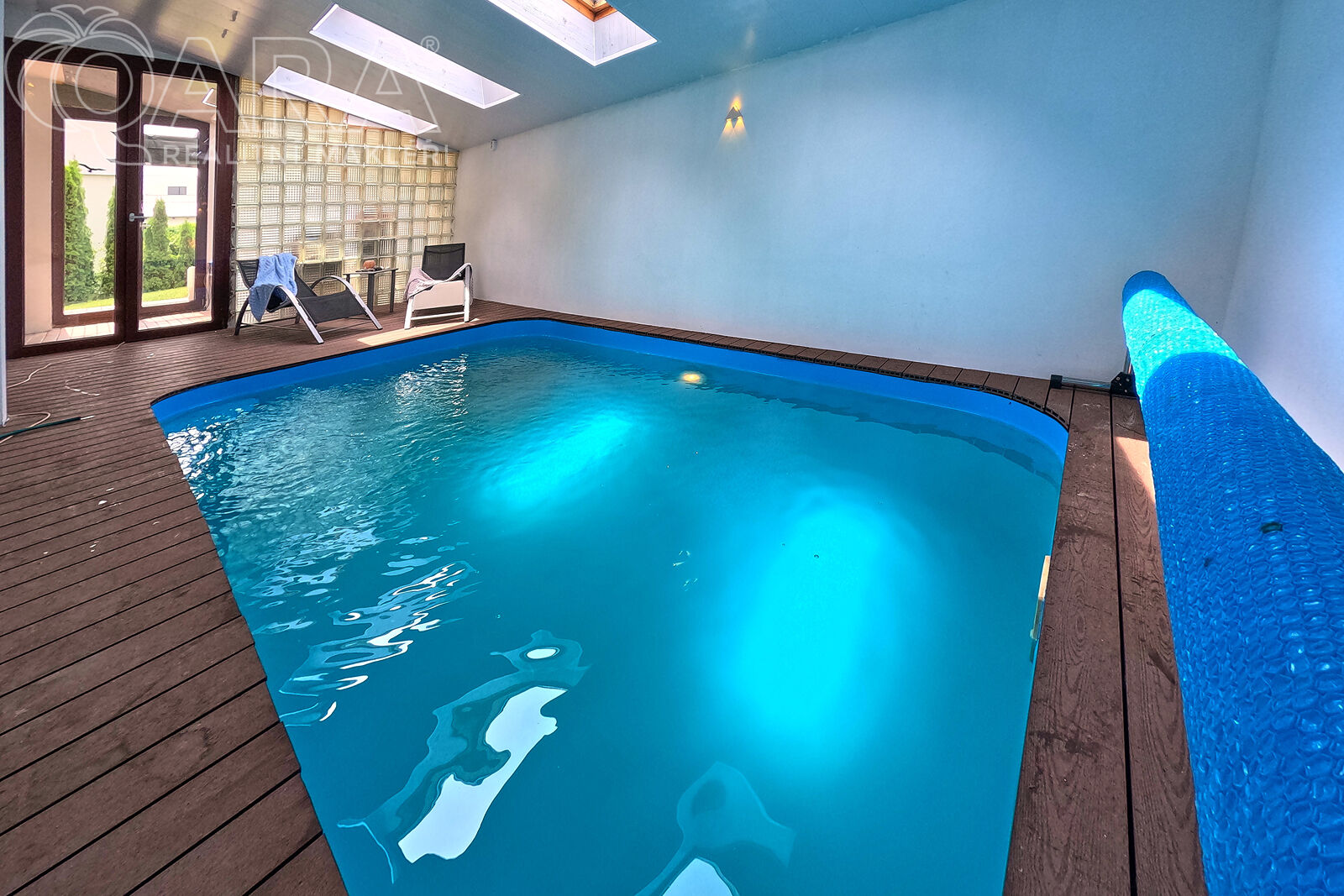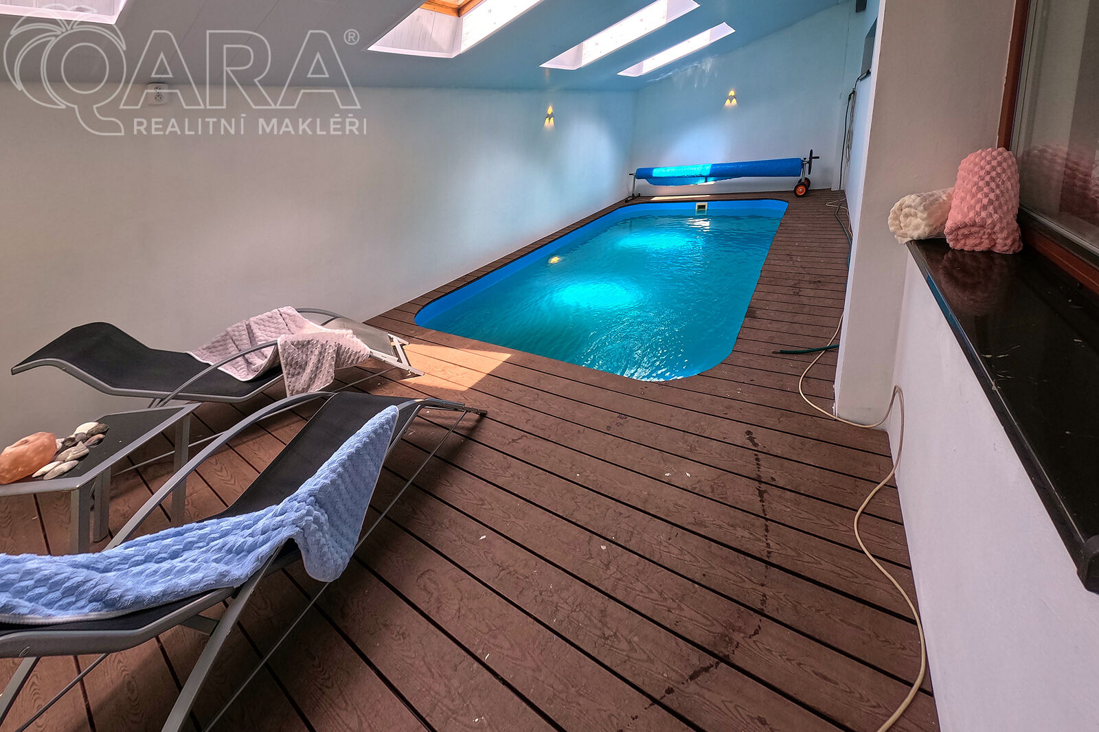 Patrový dům s dispozicí 5+kk, garáží, dvěma koupelnami, šatnou, a především s krytým bazénem, leží na pozemku o velikosti 1060 m2 a nabízí komfort 234 m2 celkové užitné plochy – 215 m2 užitné plochy + 19 m2 garáž.