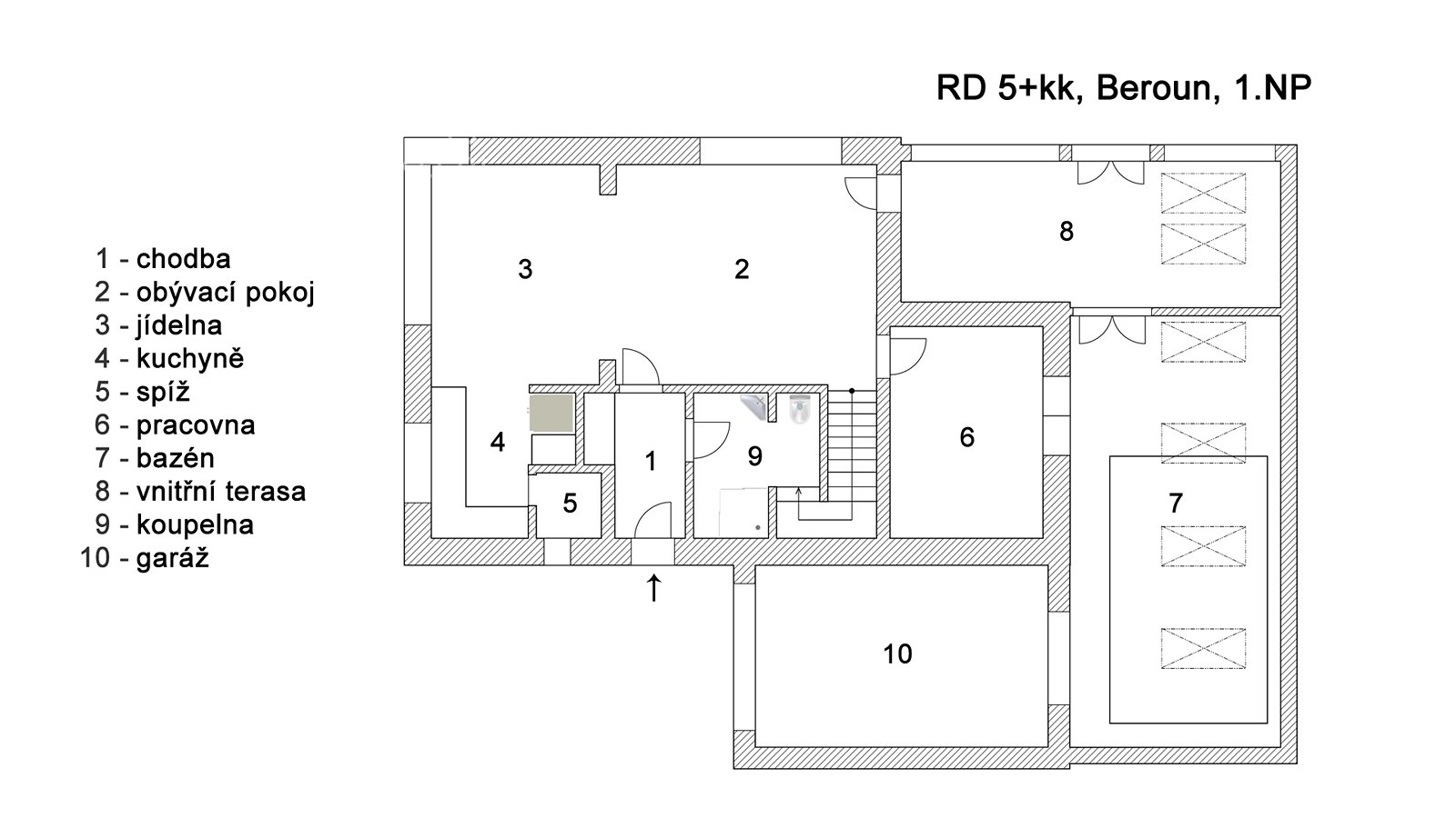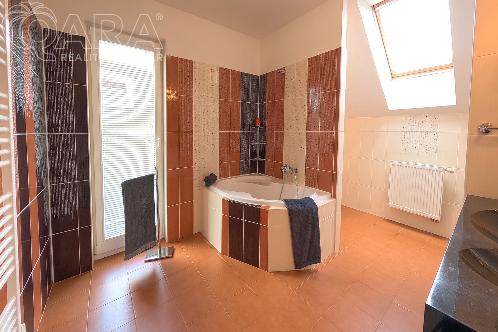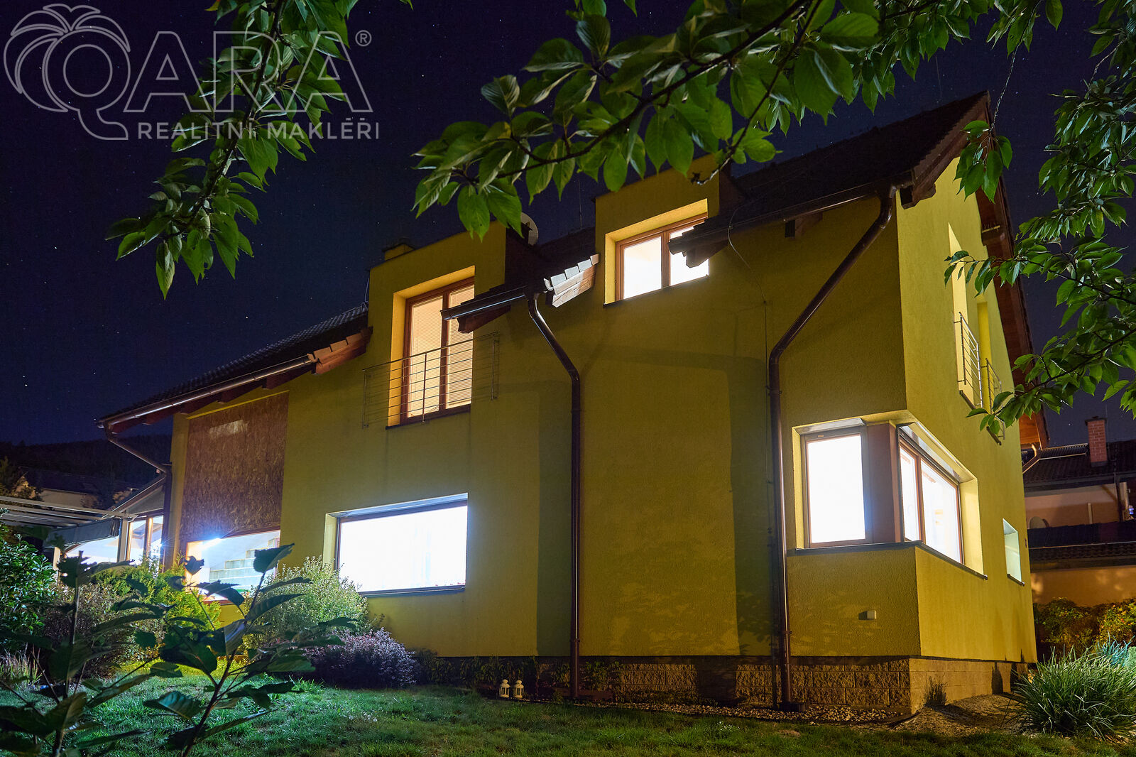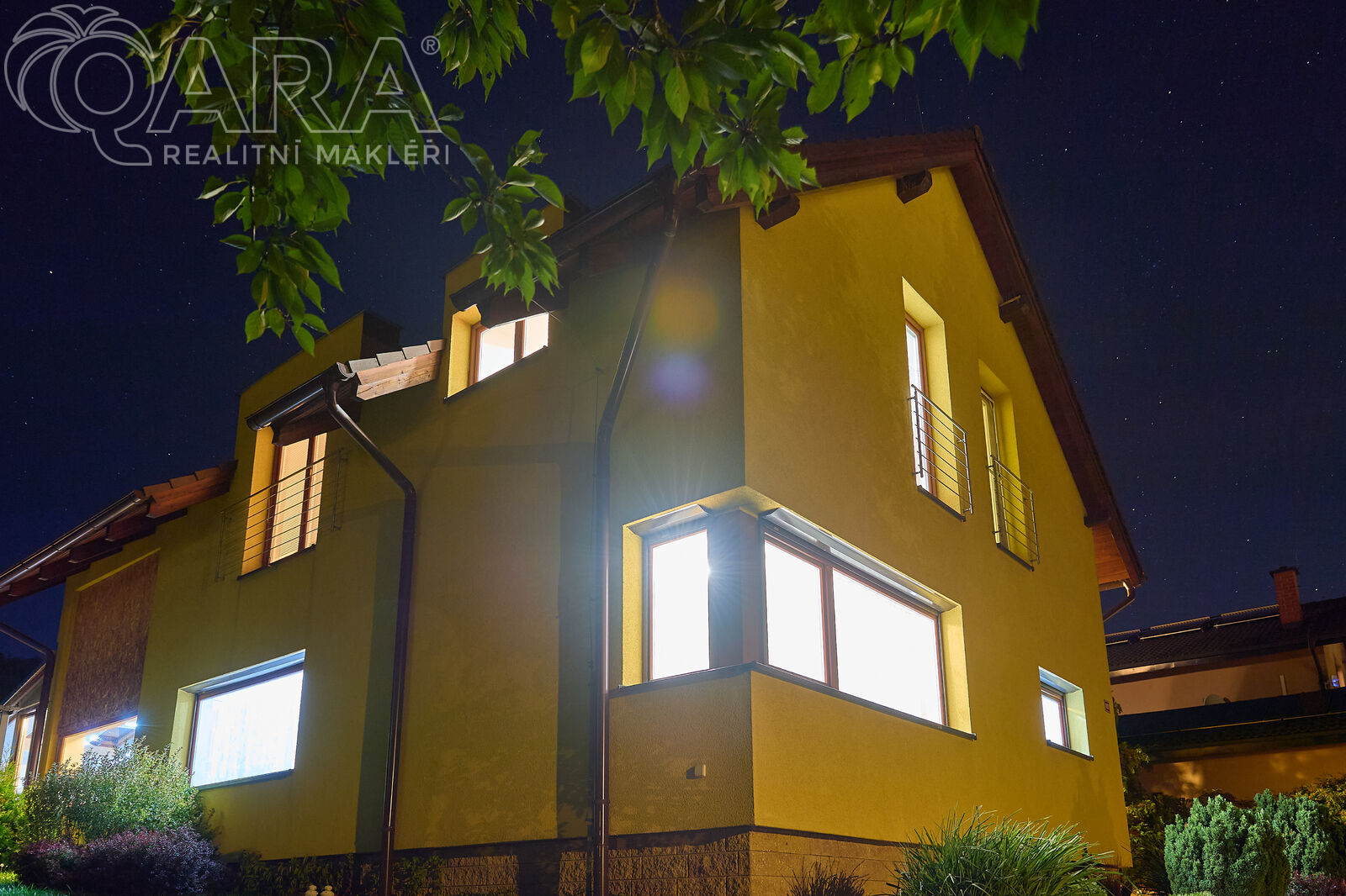 Patrový dům s dispozicí 5+kk, garáží, dvěma koupelnami, šatnou, a především s krytým bazénem, leží na pozemku o velikosti 1060 m2 a nabízí komfort 234 m2 celkové užitné plochy – 215 m2 užitné plochy + 19 m2 garáž.
