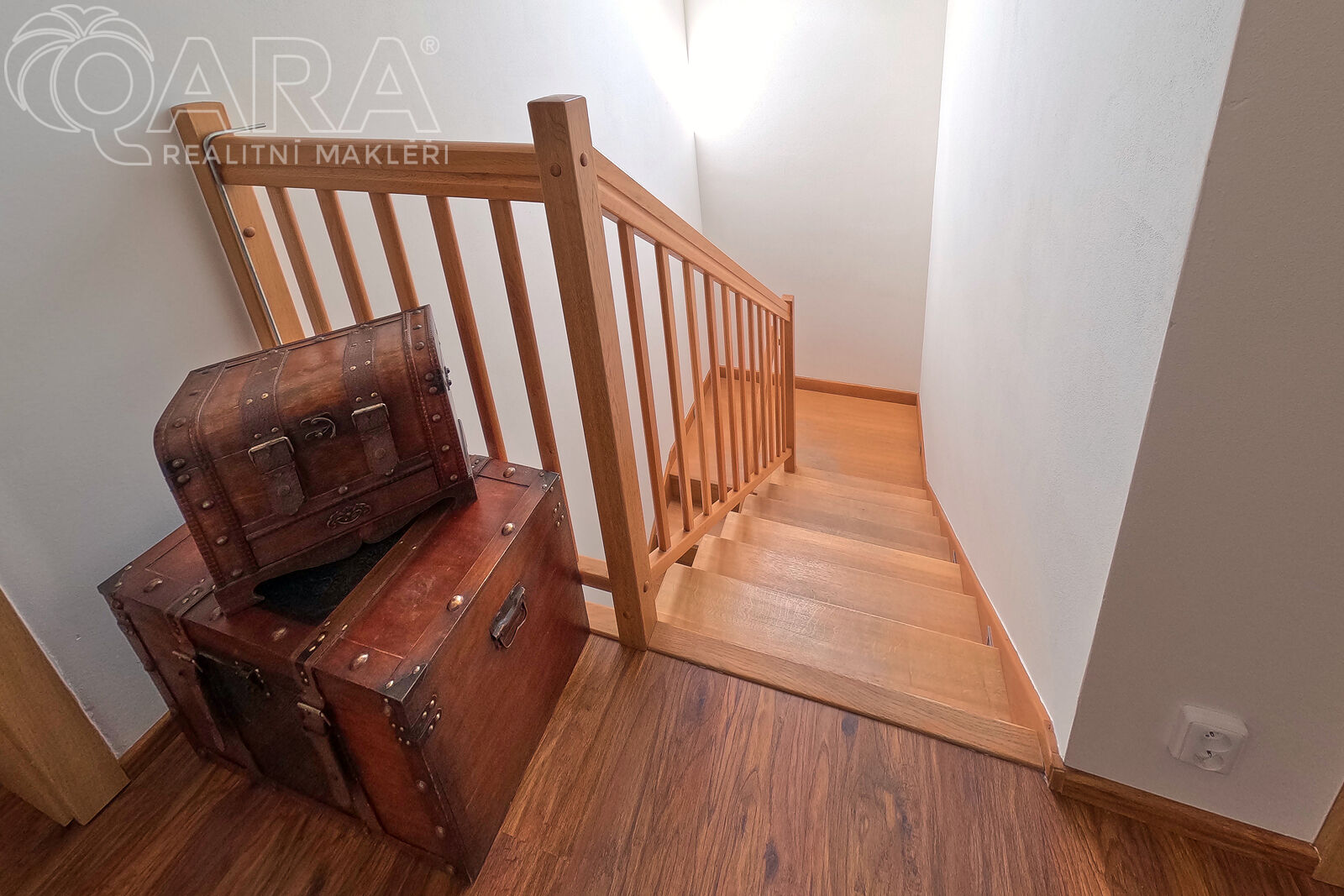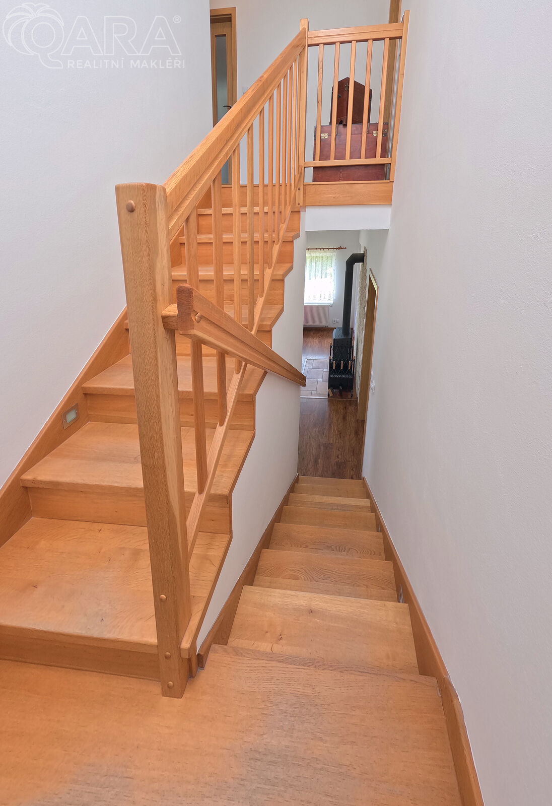Do prvního patra se vstupuje schodištěm z obývacího pokoje a kromě ložnice, šatny a velké koupelny s vanou tu jsou další dva pokoje.