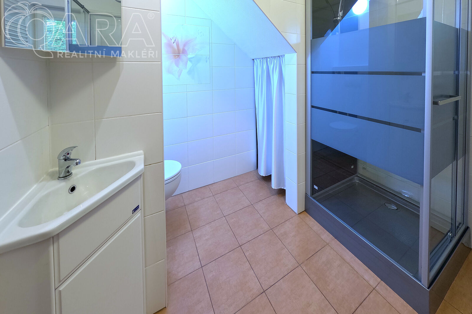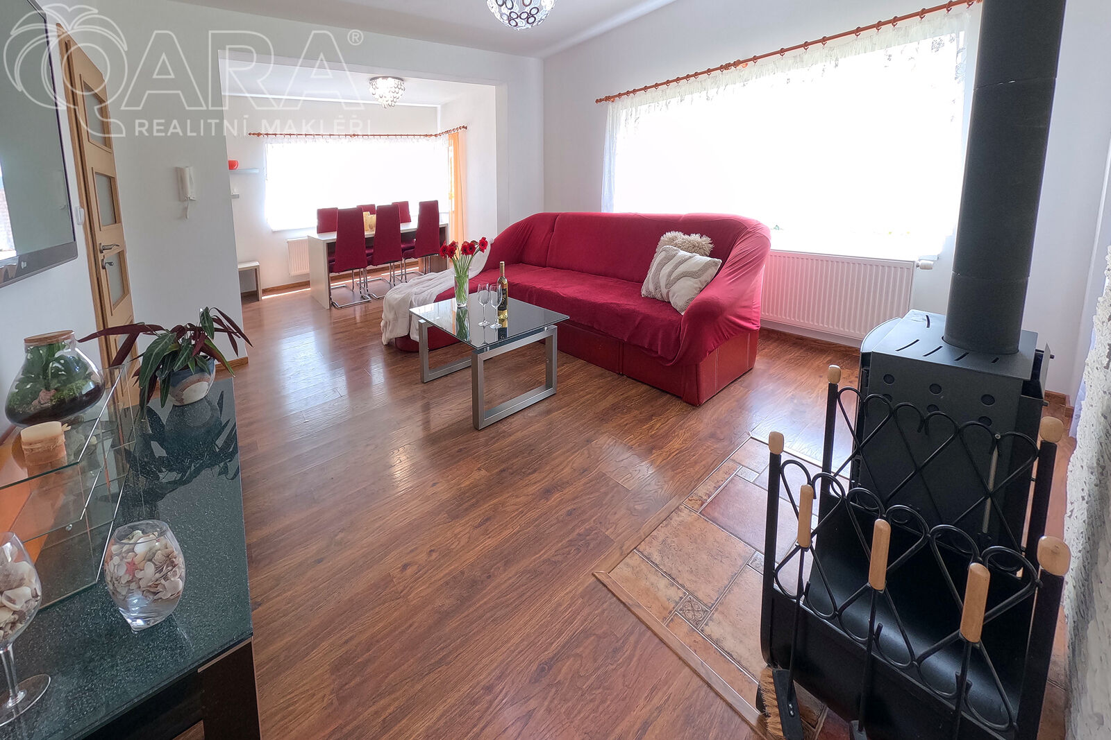 Srdcem domu je obývací pokoj s krbovými kamny a jídelna prosvětlená velkými okny. Na ni navazuje kuchyně se spíží. Dále tu naleznete pracovnu a koupelnu se sprchou.