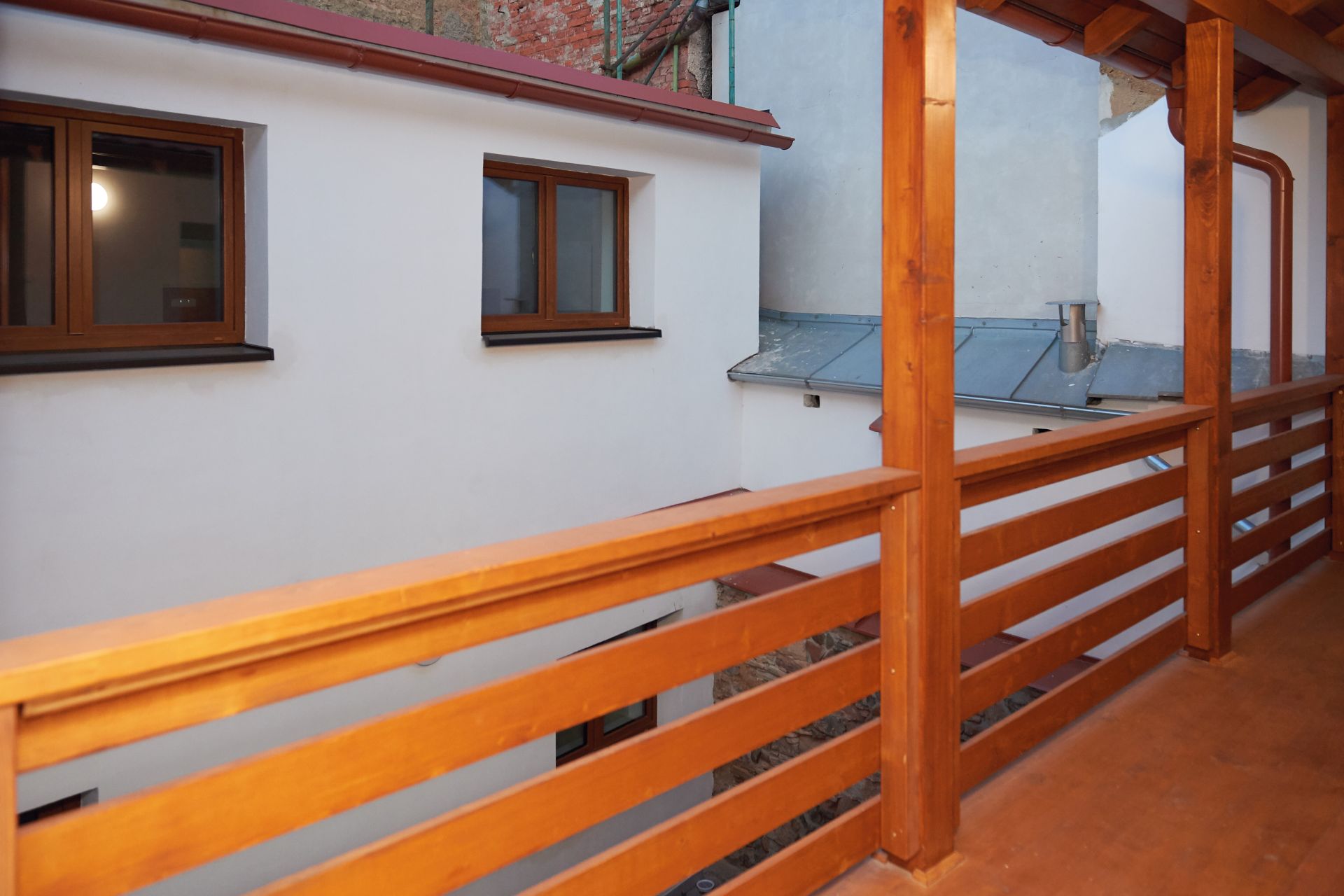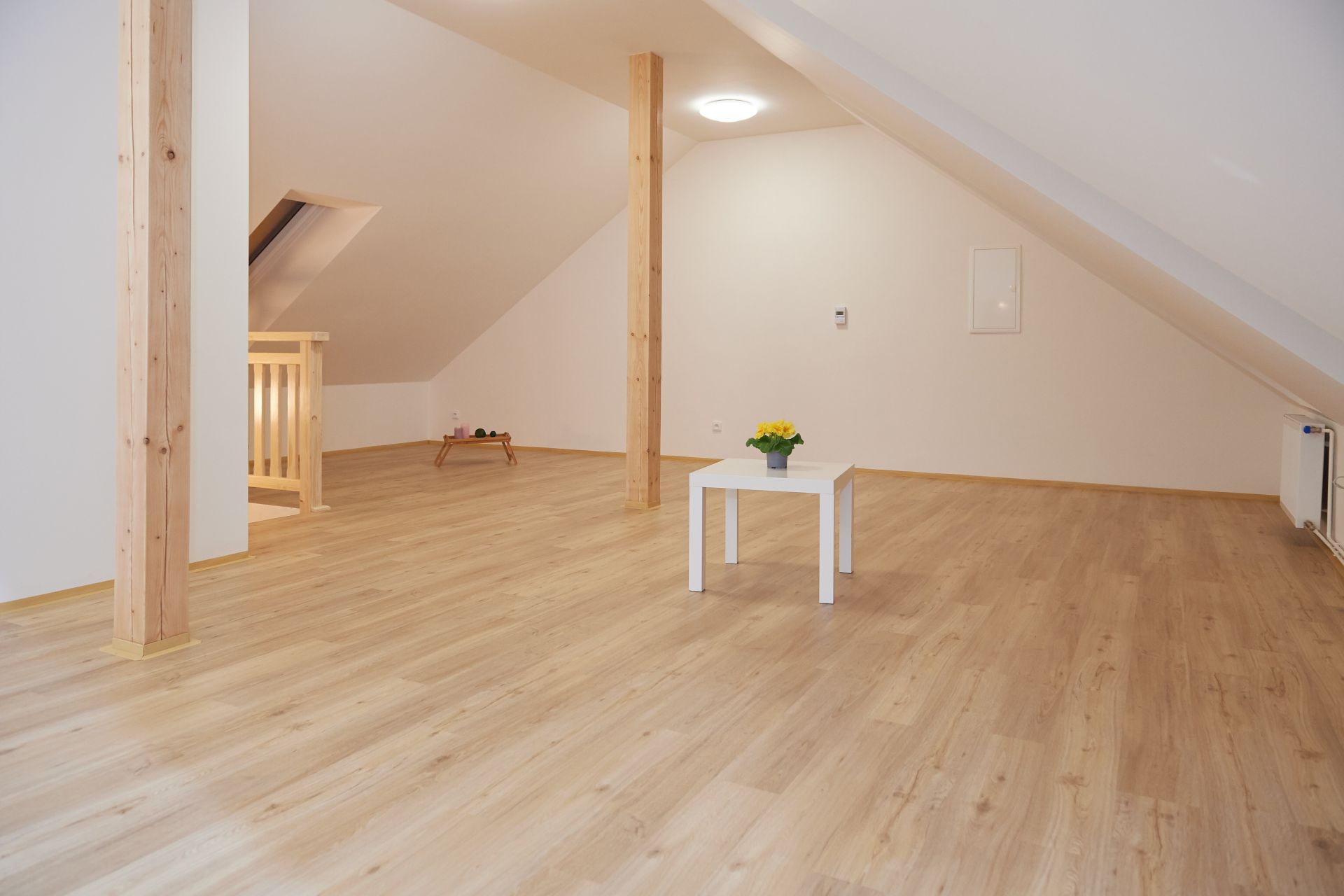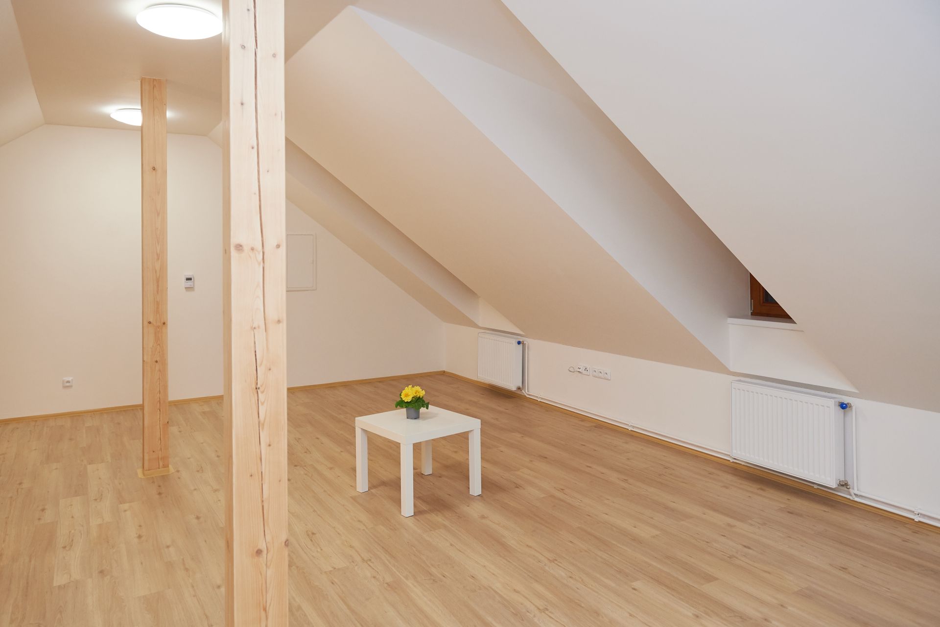 Atelier o dispozici 1+kk nadstandardní velikosti 57 m2 se nachází v podkroví dvoupatrového rodinného domu a vstupuje se do něj z pavlače o výměře téměř 7 m2.
