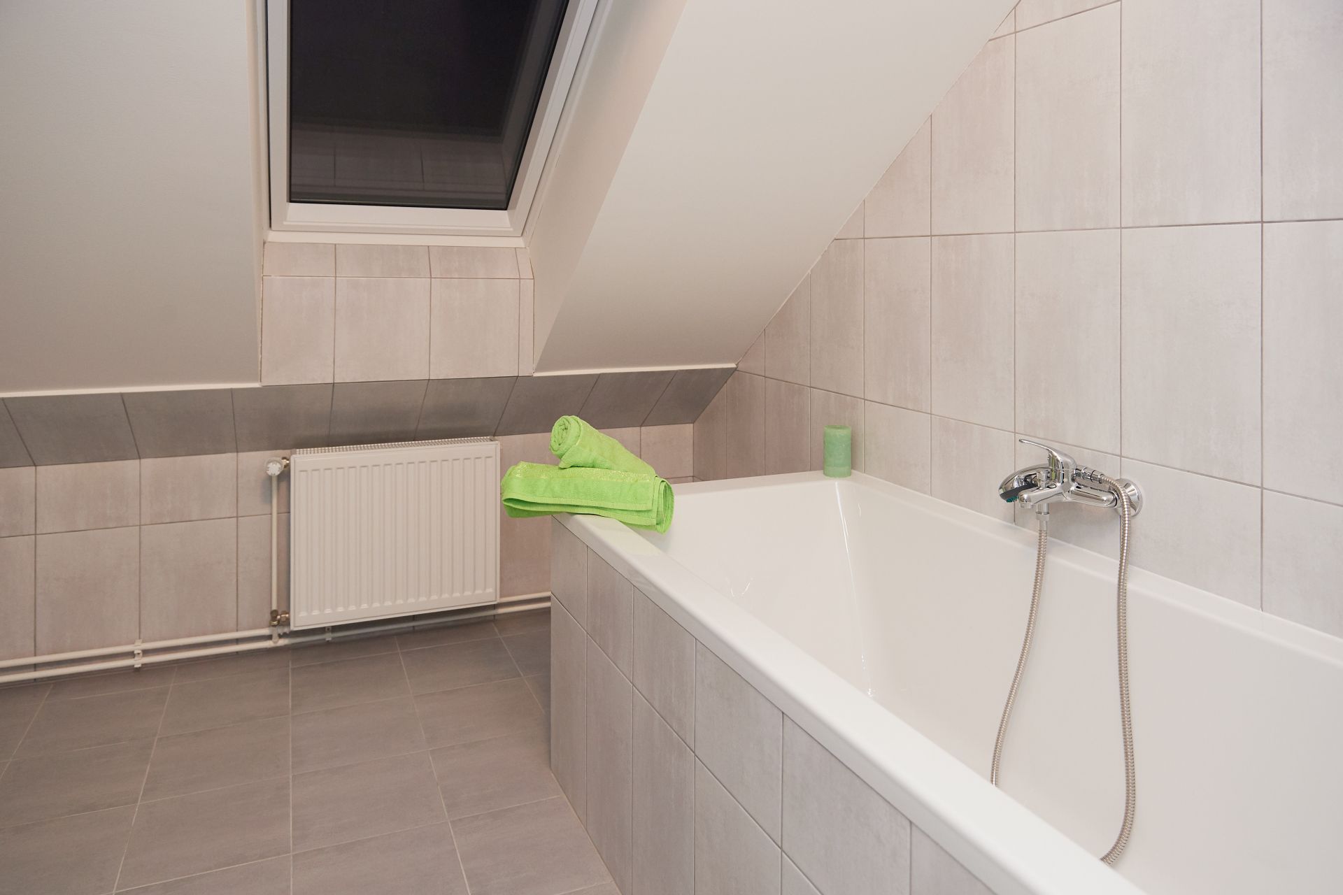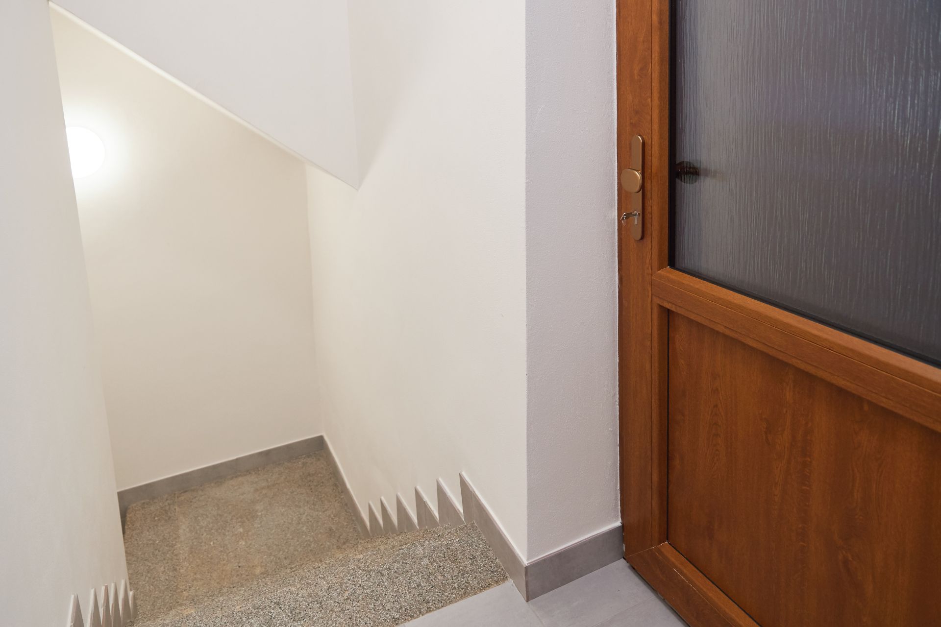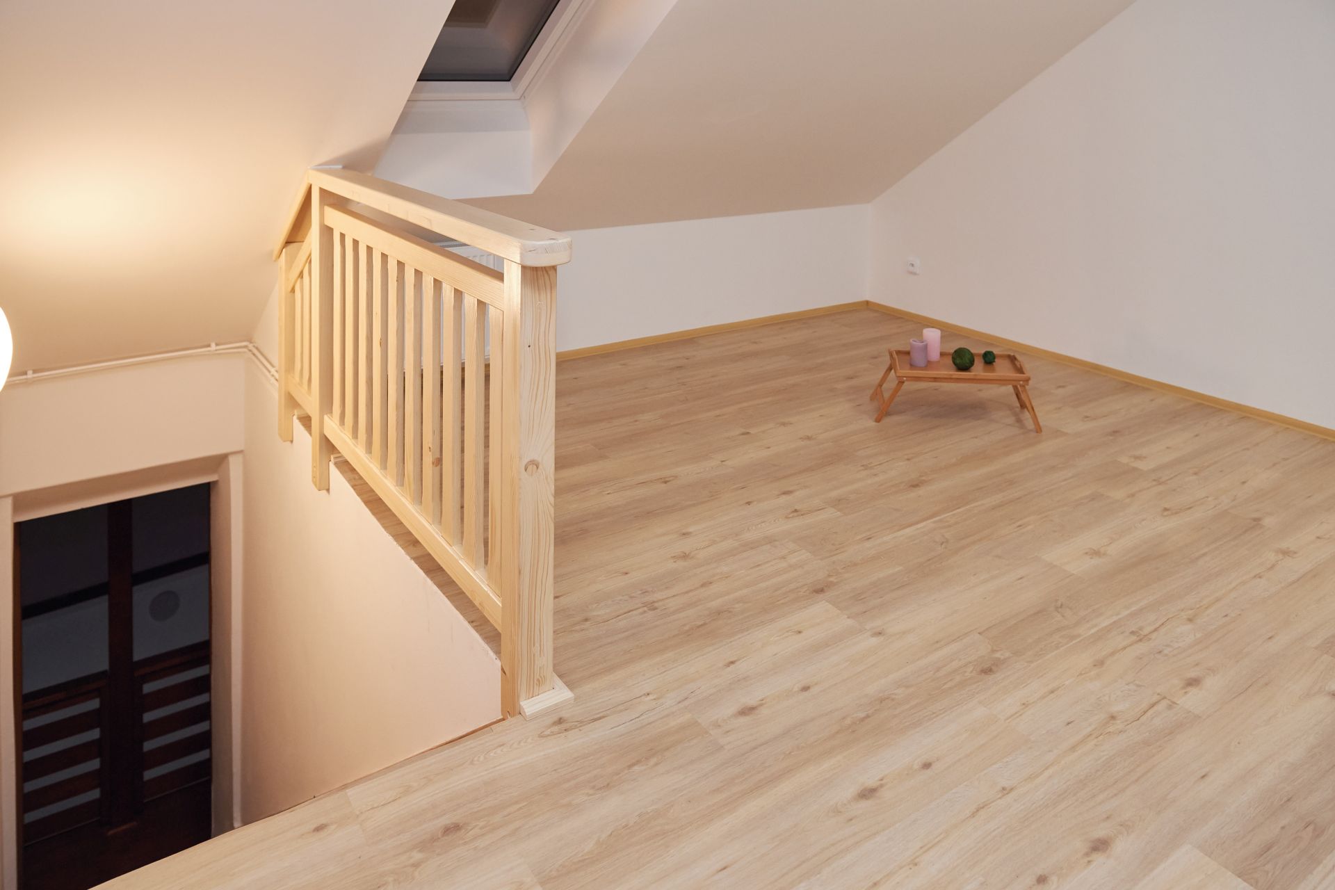Atelier o dispozici 1+kk nadstandardní velikosti 57 m2 se nachází v podkroví dvoupatrového rodinného domu a vstupuje se do něj z pavlače o výměře téměř 7 m2.