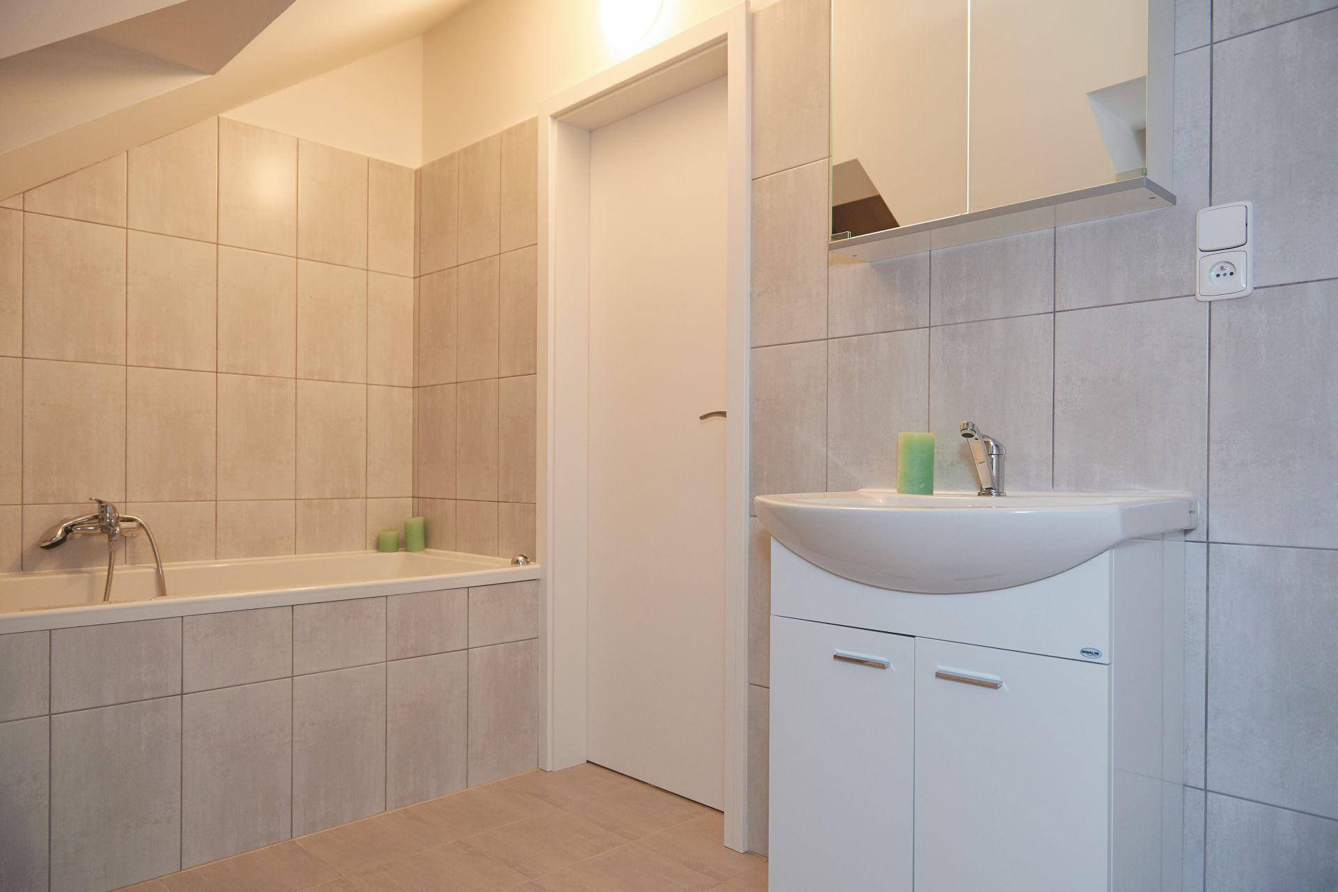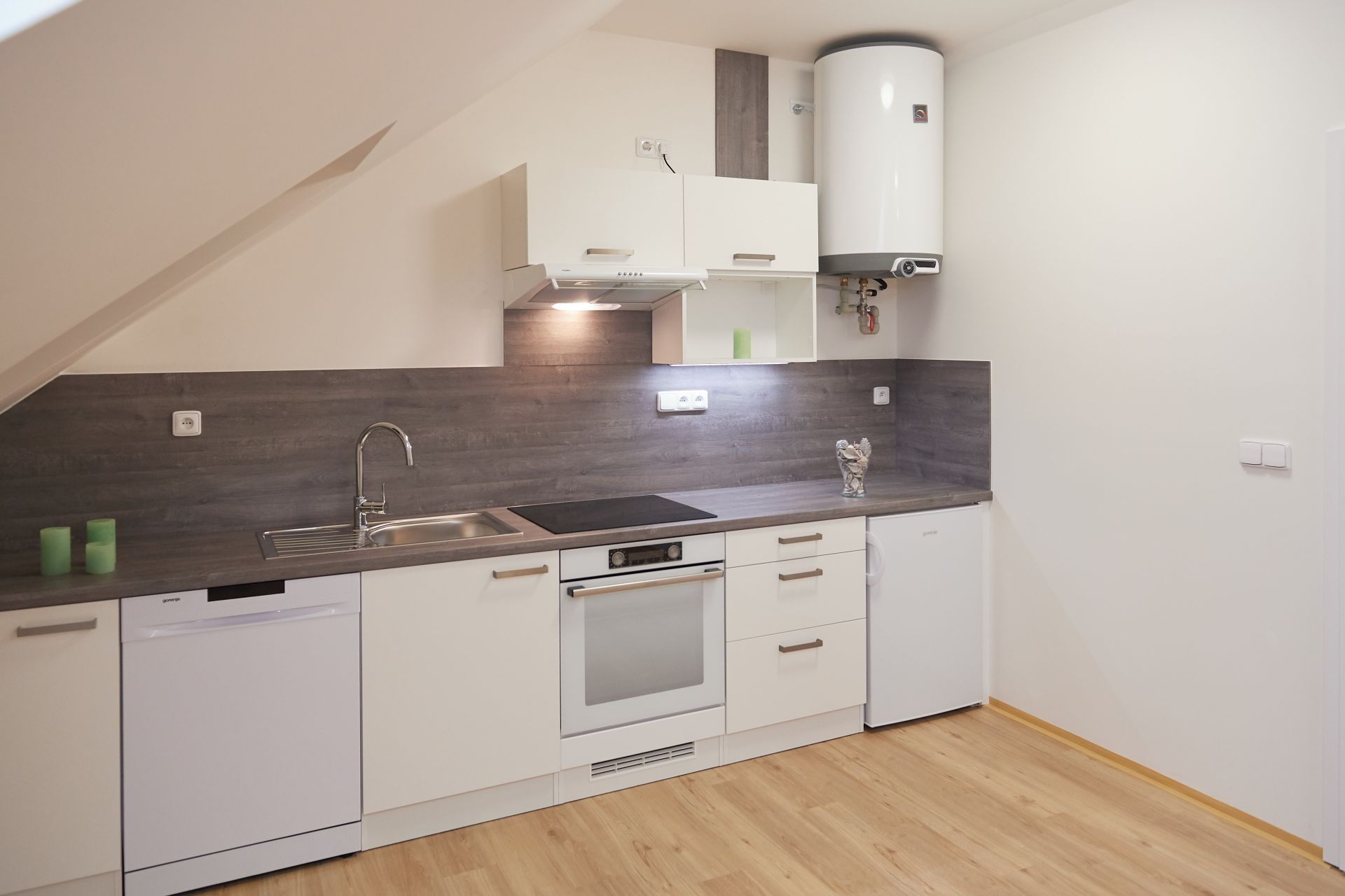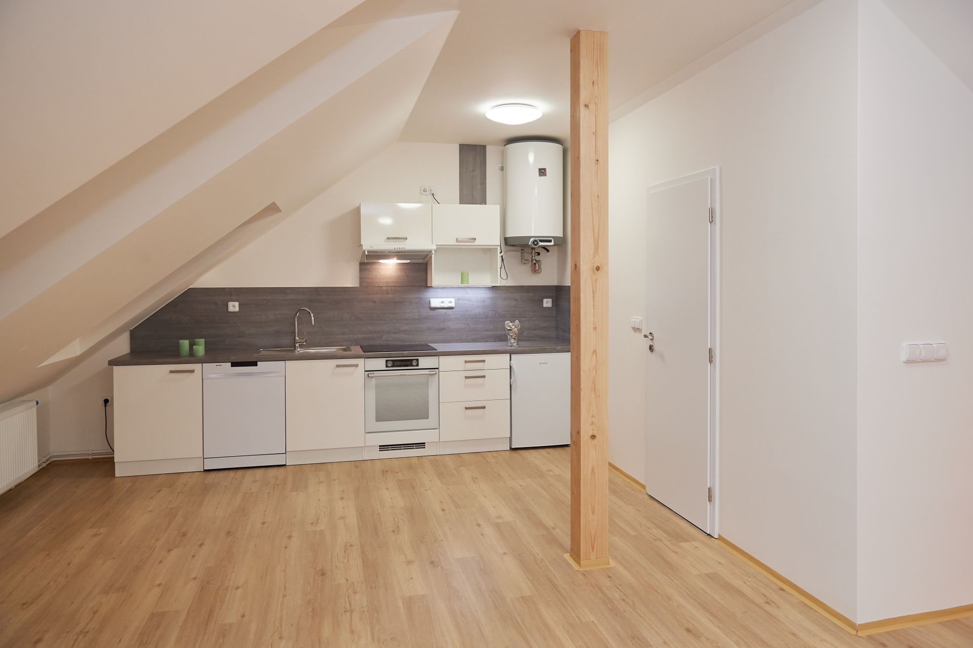 Moderně pojatý prostor má velký pokoj s kuchyní. Kuchyňská linka je vybavena vestavěnými spotřebiči – myčka, elektrická trouba, varná deska, digestoř a lednice. Okna bytu jsou orientována do ulice na jih. K dispozici je také koupelna s vanou a WC.