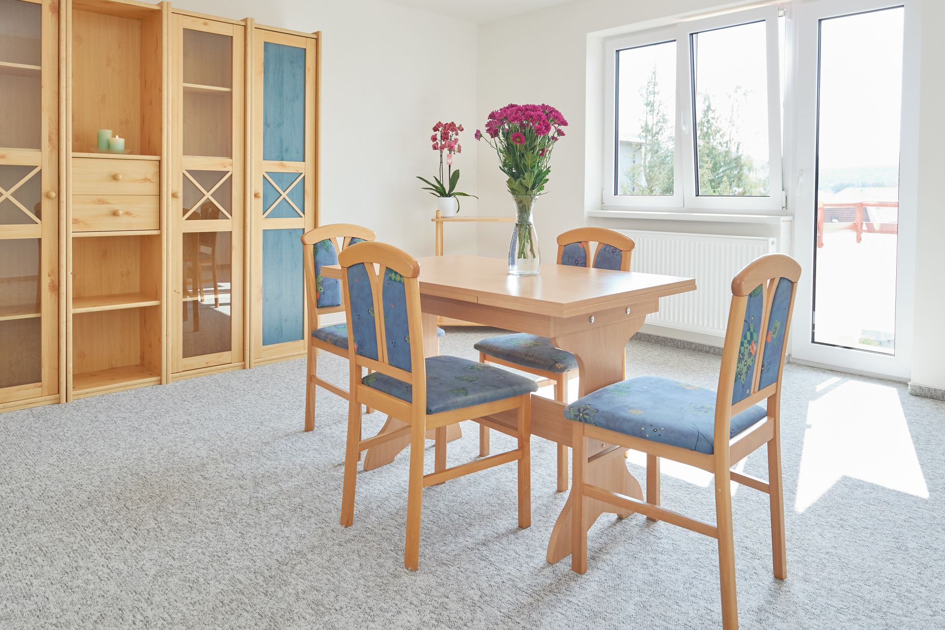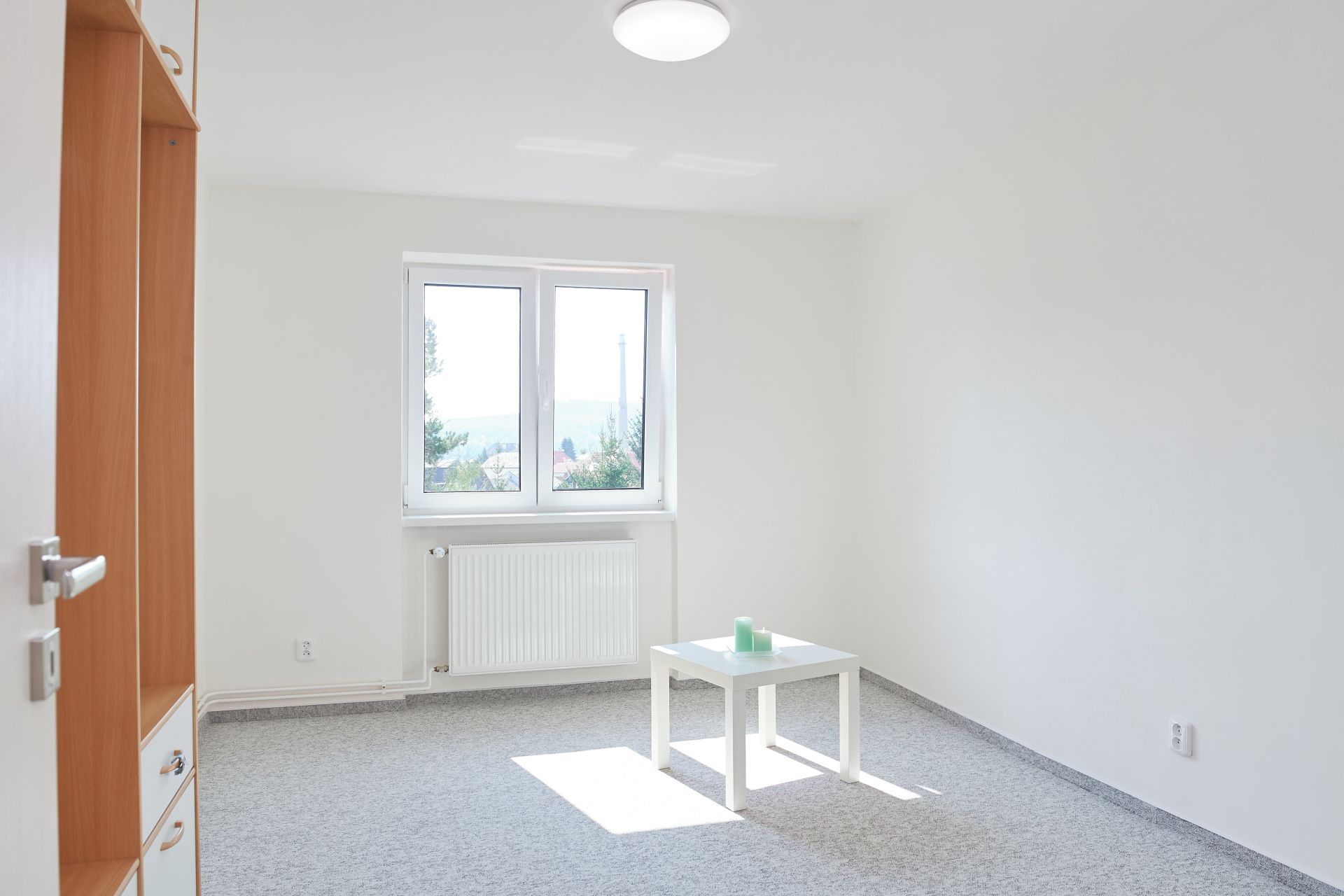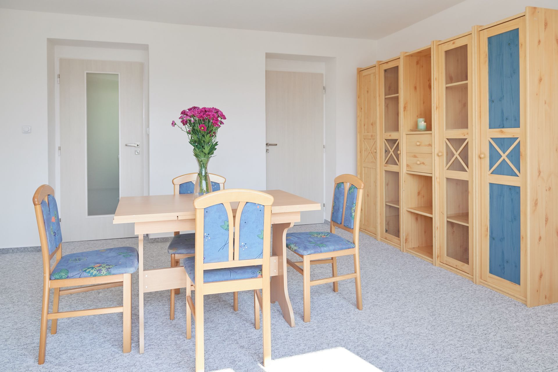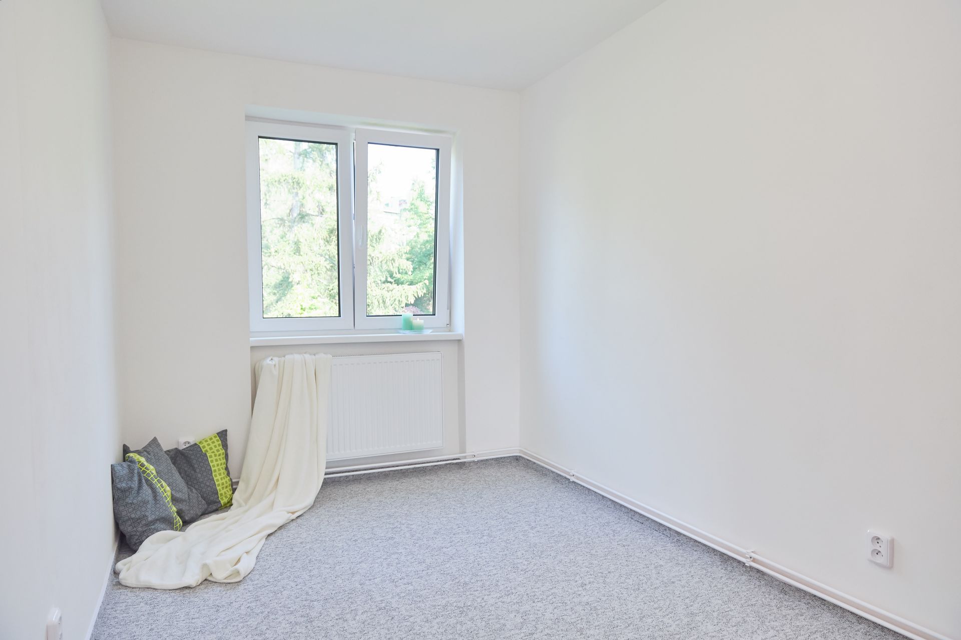 Přímo z chodby vstupujeme nejprve do jedné z ložnic a dále do velkého obývacího pokoje s balkónem. Okna obou místností jsou orientována na jih. Obývací pokoj je průchozí do menší ložnice. Z chodby vstupujeme do kuchyně s novou kuchyňskou linkou. Je zde také příprava na zapojení pračky. Koupelna se sprchovým koutem je průchozí do samostatného WC.
