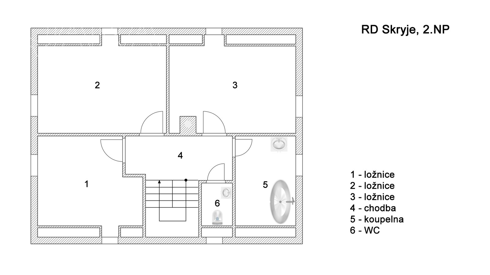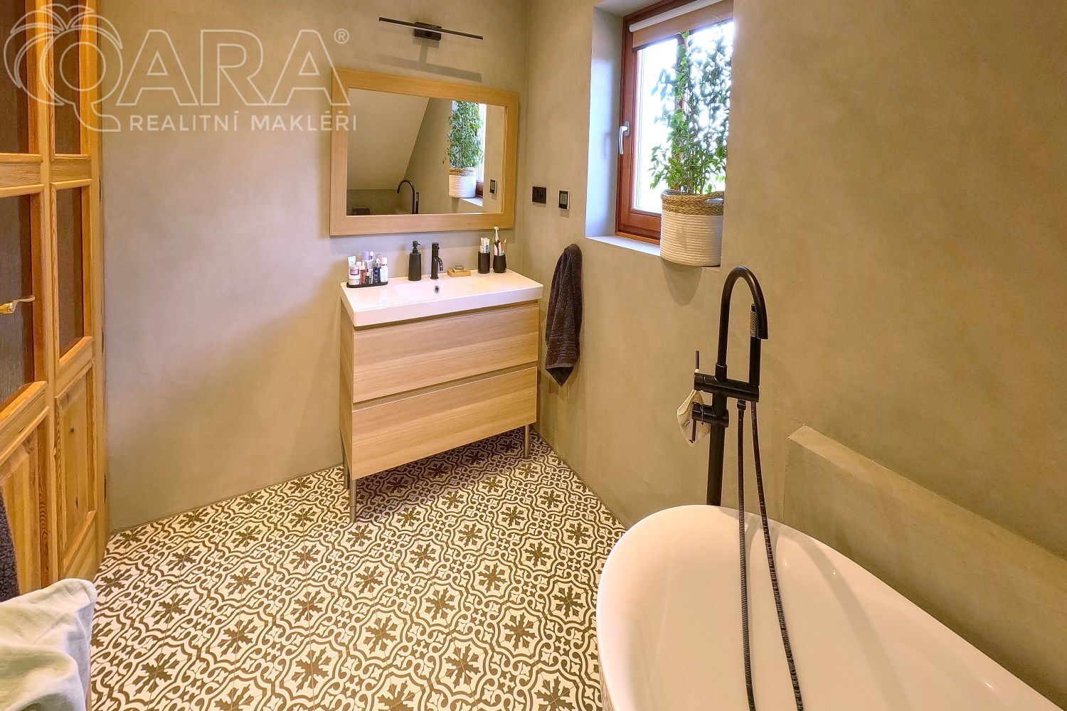 Do patra vede dřevěné schodiště a naleznete tu 3 pokoje, moderní koupelnu se samostatně stojící vanou a samostatné WC.
